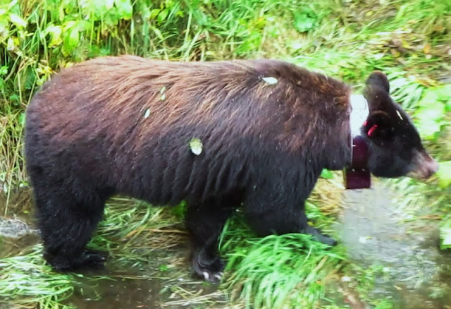 I did a whales and trails tour today that went quite well! We were all standing at the Steep Creek bridge, ready to leave when we saw Nicky, also known as "the little mom" stroll into view with her two cubs in tow. Nicky is about 14 and is on her fifth litter. She's been fitted with a radio collar by the Forest Service so that they can track her whereabouts to make sure that she's not getting into trouble. Data collected includes feeding locations, hunting grounds, dens, and residential wanderings. She's one of a few bears that have been tracked with radio collars by the Forest Service, and the information they receive from Nicky will help them to understand more about black bear populations in the area around the Mendenhall Glacier. She's a beautiful cinnamon-colored black bear.